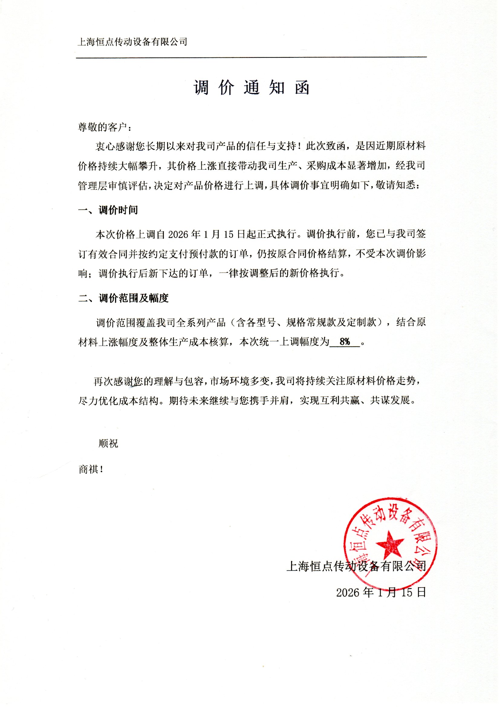 衷心感謝您長期以來對我司産品的信任與支持!此次緻函 ,是因近期原材料價格持續大幅攀升,其價格上漲直接帶動我司生産、採購成本顯著增加,經我司管理層審慎評估,決定對産品價格進行上調,具體調價事宜明確如下,敬請知悉: