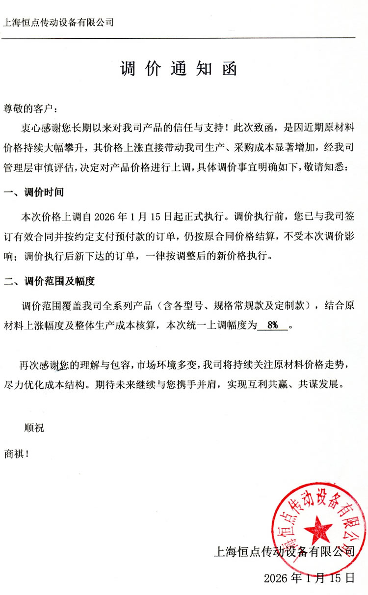 本次價格上調自2026年1月15日起正式執行。調價執行前,您已與我司簽訂有效合同並(bìng)按約定支付預付款的訂單,仍按原合同價格結算 ,不受本次調價影響;調價執行後新下達(dá)的訂單,一律按調整後的新價格執行。