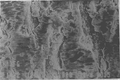 油膜相對於重載很薄的潤滑條件下運轉的齒輪副工作齒面的損傷。損傷面放大後可見密密麻麻成片的微小蝕微小裂紋。