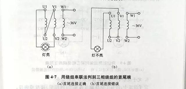 先用萬用表将繞組的6根引線分成3個獨立繞組,然後按圖4-7所示的接法通以低壓交流電(diàn)源(所加電(diàn)壓應使繞組中的電(diàn)流不超過額定值)。如果燈(dēng)泡發亮,則說明串聯的U、V兩相繞組是正向串聯。即一相繞組的首端接另一相繞組的尾端,如圖4-7(a)所示 。如果燈(dēng)泡不亮,則說明是反向串聯,如圖4-7(b)所示。這時,可将一相繞組的首尾端對調再試。判斷出前兩相的首尾端後,将其中一相再與第三相串聯,用同樣方法實驗。最後,可以判斷出三相繞組各自的首尾端。