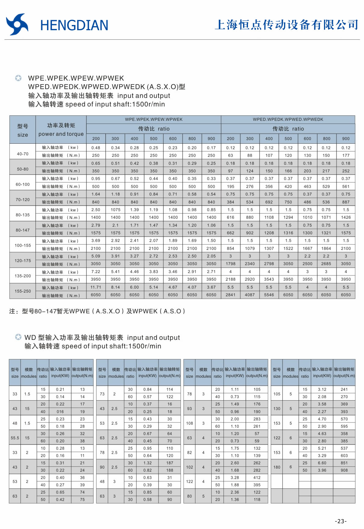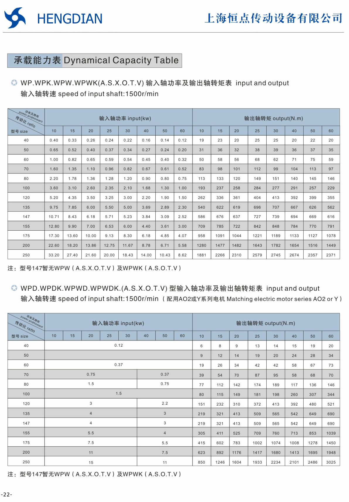 WP系列減速機承載能力表1
