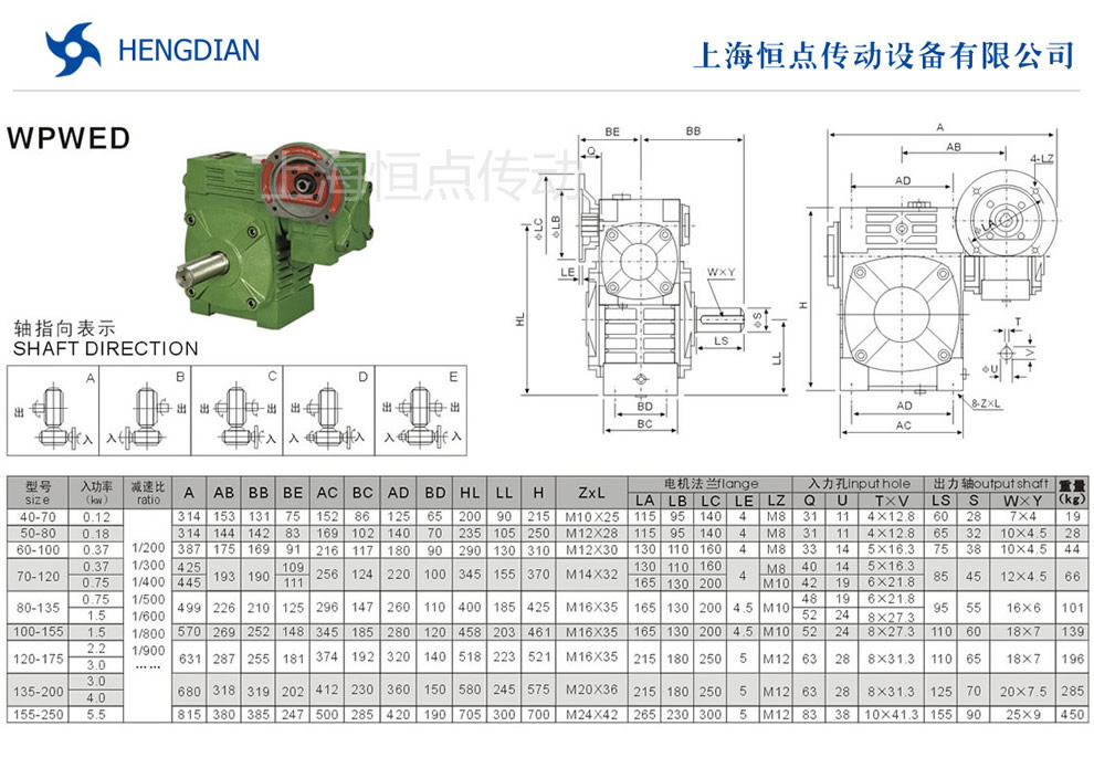 WPWED雙級萬能減速機的外形安裝尺寸.WPWED雙級蝸輪蝸杆減速機選型指南,WPWED雙級減速機法蘭輸入,軸輸出.WPWED雙級減速機軸指向表示方法.機座号40-70到155-250,速比200到900.