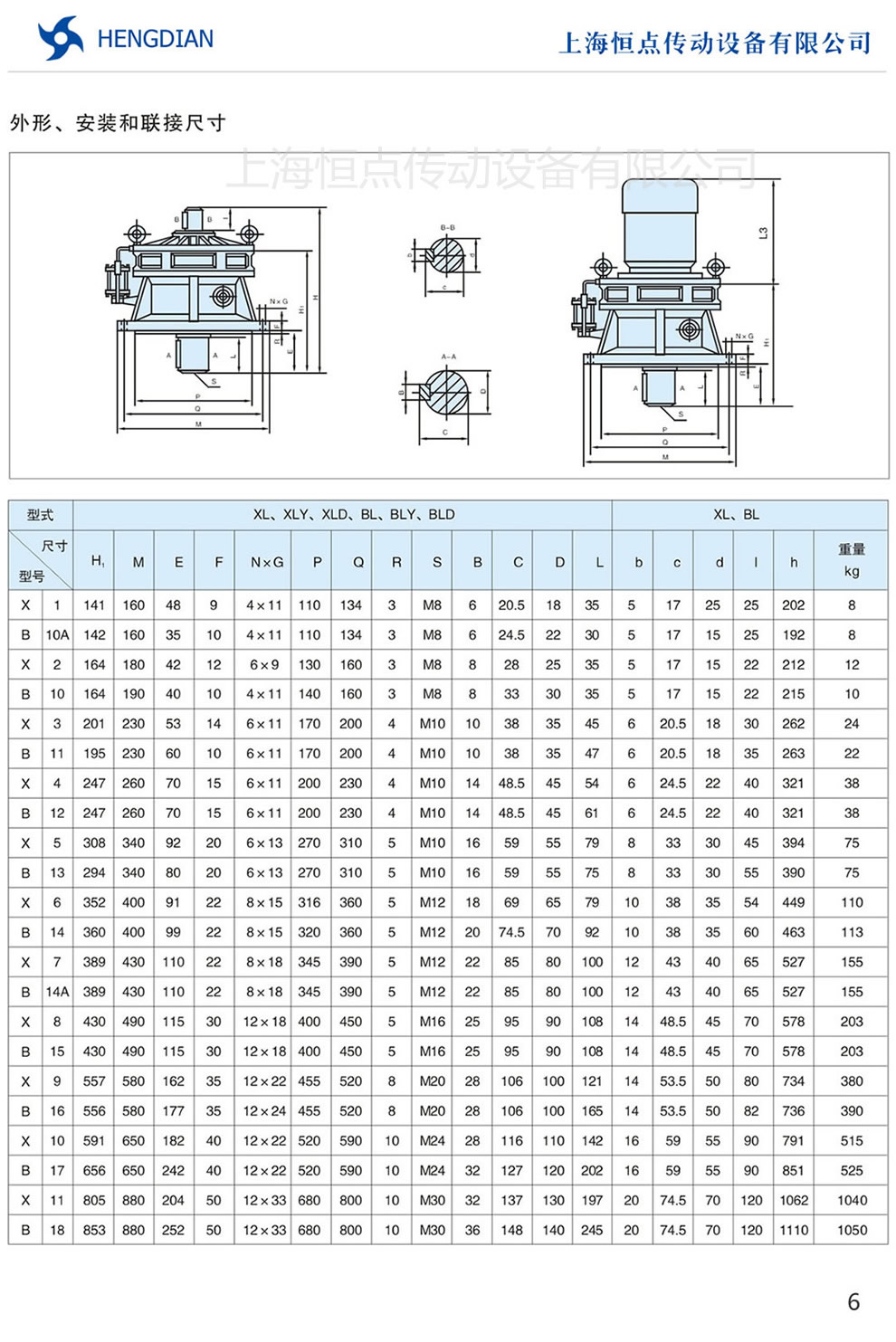 X/B系列擺線針輪減速機 詳細選型參數及尺寸參數: